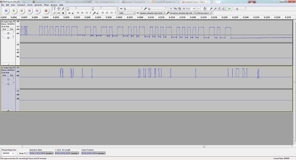When sniffing the codes for the remote controlled mains sockets, I used an oscilloscope. However, inspired by Geoff Johnson I decided to use Audacity to sniff the codes used by my wireless thermostat. This is the 433MHz ASK receiver I've been using to receive and decode the signals, by the way.