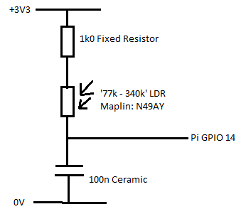 The obvious problem with this idea is that the Pi doesn't have any analogue inputs, only digital. This doesn't really cause us too much of a drama though - we can cheat by using the LDR to charge a capacitor, then using the digital input in order to time how long the capacitor takes to charge. The longer it takes, the darker it is.